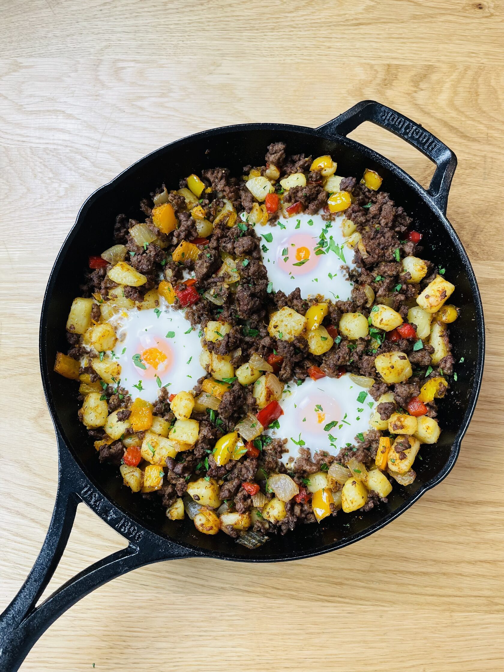 Коли картопля підсмажиться, додайте нарізані кубиками перець і цибулю та смажте, доки вони не стануть м'якими, приблизно 5-7 хвилин.