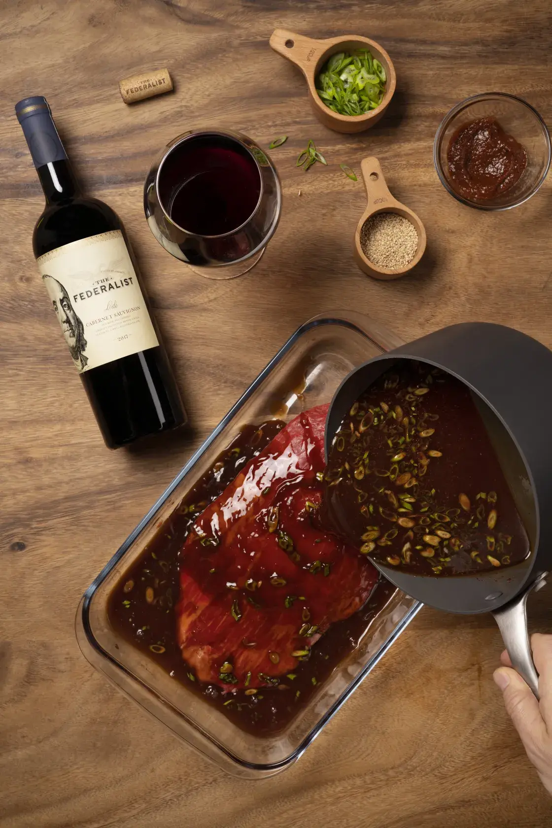 Головне — правильно підібрати вино. Обирайте сухе (наприклад, каберне або мерло), а не напівсолодке — воно краще працює з м’ясом і не дає надмірної нудотності.