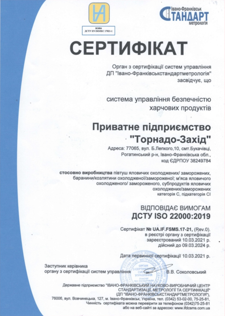 Орган сертифікації систем управління ДП Івано-франківськстандартметрологія засвідчує виробництво продукції цієї компанії відповідає вимогам ДСТУ ISO 22000:2019